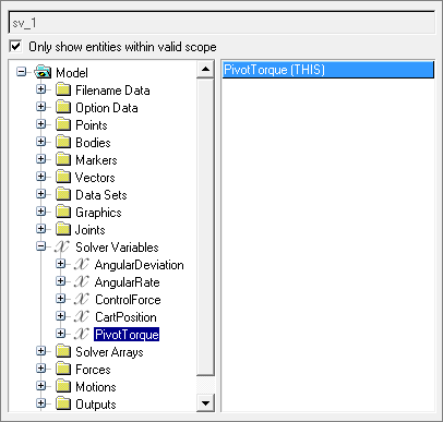 2つのソルバー変数ControlForce (varname:sv_0)およびPivotTorque (varname:sv_1)を以下のように作成します。