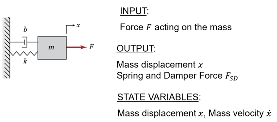 このチュートリアルで扱うモデルは、下図に示すマス-ばね-ダンパーシステムです。