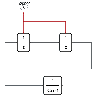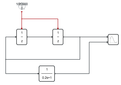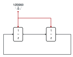 - から、DiscreteDelayブロックを2つダイアグラムにドラッグします。