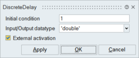 DiscreteDelayブロックをダブルクリックします。ブロックダイアログで初期条件(Initial condition)に 1と入力してOKをクリックします。