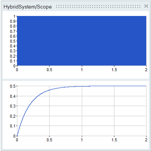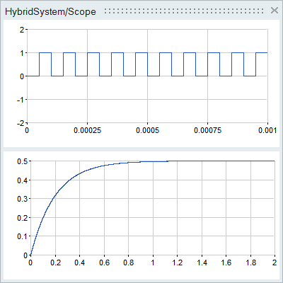 スコープウィンドウが表示されます。Scopeブロックは2つの入力で定義されているため、それぞれ矩形波信号とシステム応答に対応する2つのサブプロットが表示されます。矩形波の周波数は10,000Hzであるため、0秒と2秒の間の時間間隔内に非常に多くの周期が存在します。したがって、狭い範囲を拡大して確認する必要があります。