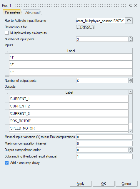 - Fluxブロックをダブルクリックします。ブロックダイアログでFlux to Activate input filenameに、Fluxから生成した連成コンポーネントのパスを入力します:<working_directory>/ IPM_motor_Multiphysics_position.F2STA.F2STA