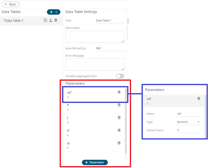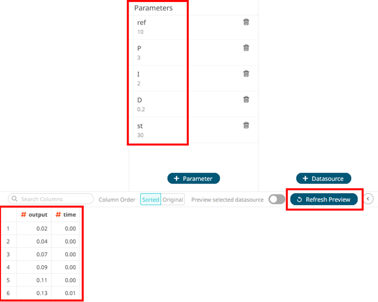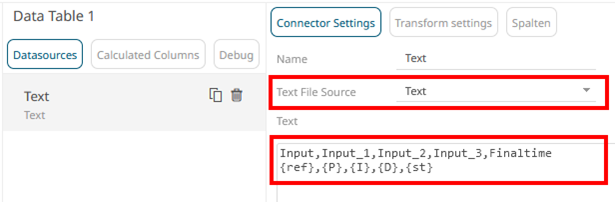 The following text is used to create a table using the parameters created in the data table:Input,Input_1,Input_2,Input_3,Finaltime {ref},{P},{I},{D},{st} -