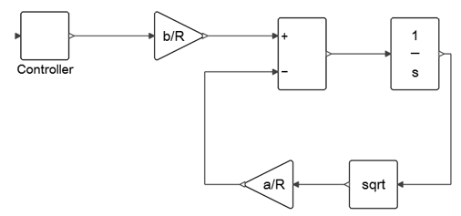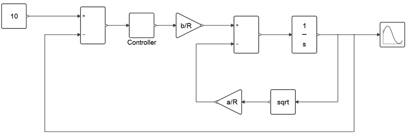 タンクへの水の流入率qinを制御すると、指定された時間内で水位hに達することができます。このシステムモデルの入力と出力はそれぞれ1つのみ(qinとqout)なので、水の流量を制御するには従来型のPIDコントローラーを追加する必要があります。