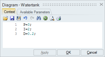 コンテキスト変数P、I、Dはメインダイアグラムのコンテキストで定義されますが、モデルのその他の部分で使用される変数もこれらの値を受け取ります。ただし、ローカルコンテキストで定義された値は除きます。