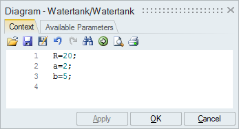 コンテキスト変数R、a、bは、スーパーブロック内部のダイアグラムで定義します。これらの変数のスコープはセミグローバルです。つまり、これらの変数を認識できるのは、現在のダイアグラムの中および現在のダイアグラムにあるすべてのスーパーブロックの中のみです。Gainブロックは現在のダイアグラム内にあり、変数R、a、bを含むため、これらの変数はコンテキストタブで指定した値に基づいて定義されます。
