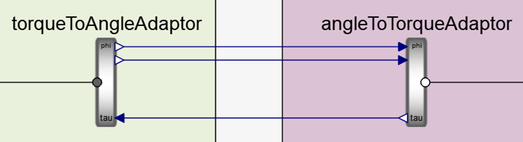 These adaptors add directionality to the connection. On the Engine subsystem, the TorqueToAngleAdaptor provides the rotational angle (and its derivative) as output, and the Load subsystem takes angle as input and provides torque as output, thus forming a perfect pair.