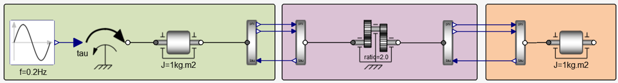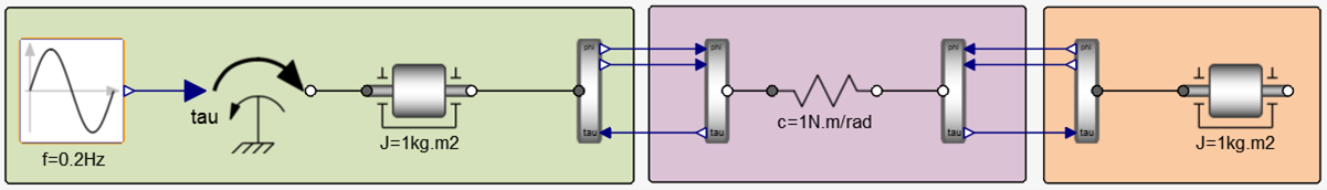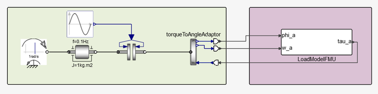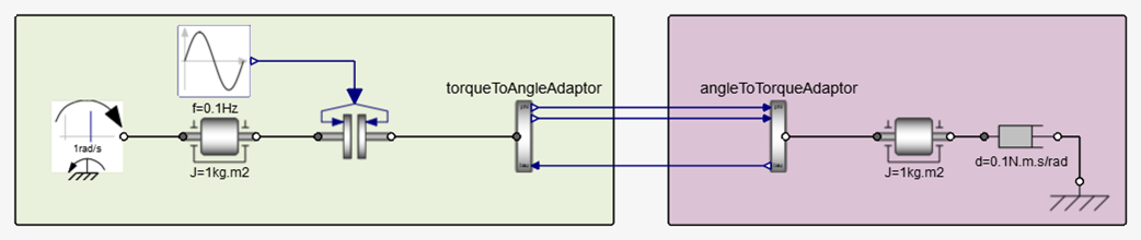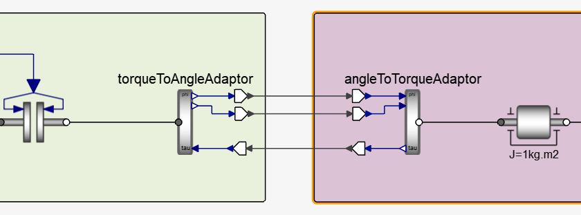 Although the model could run perfectly fine even by switching sides (AngleToTorque on the left and TorqueToAngle to the right), it is generally preferred to let the main co-simulation framework hold the rotation angle.