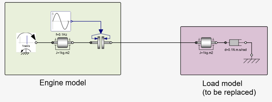 The example consists of two main parts: an engine subsystem and a load subsystem. Assume that the latter has to be replaced by an FMU providing the same capabilities, thus identifying a split on the interface between the two subsystems.