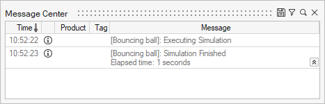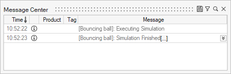 Message Centerウィンドウには、シミュレーションのモデル名、ステータス、経過時間が表示されます。また、シミュレーション段階で発生したエラーについては、警告が表示されます。