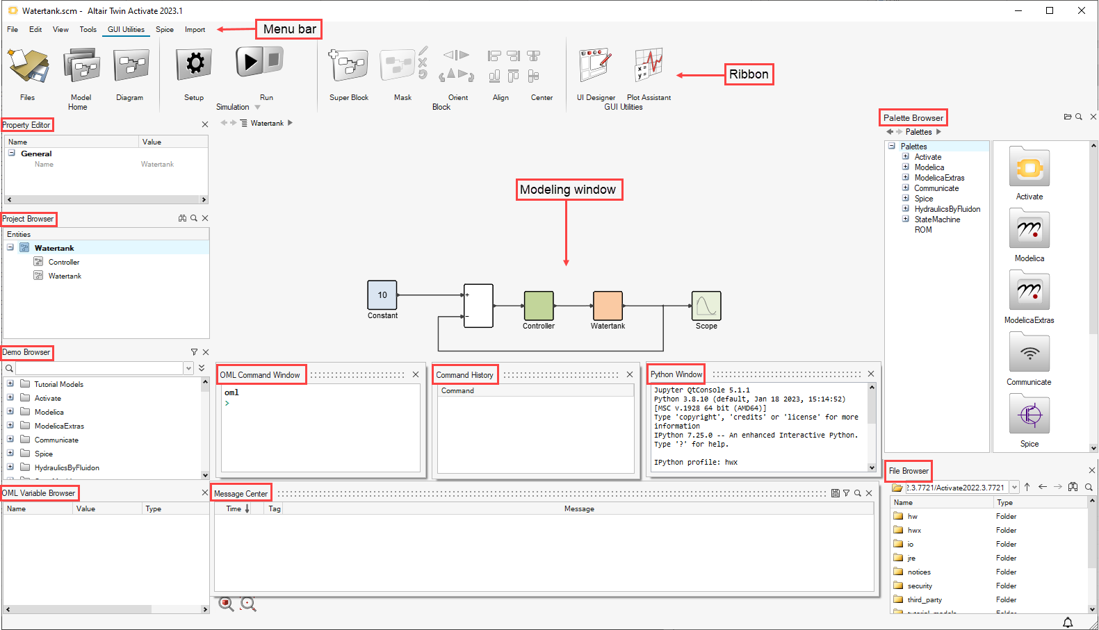 プロジェクトブラウザ、ファイルブラウザ、変数ブラウザ、パレットブラウザ、プロパティエディター、コマンド履歴、OMLコマンドウィンドウにアクセスできます。シミュレーション