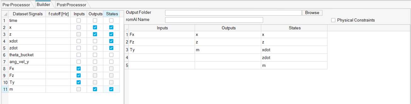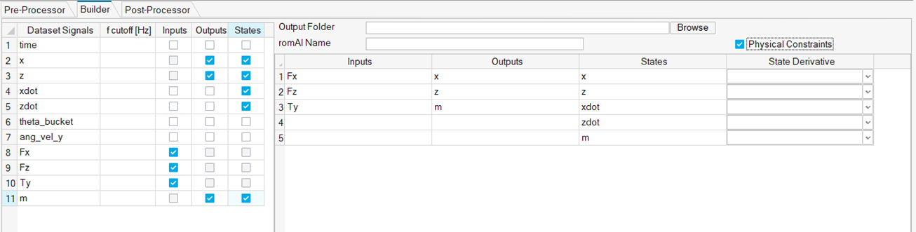 Adding physical constraints is an option if state variables exist. If state variables do exist, it is possible for one state variable to be the derivative of another. Since romAI technology is a mix of AI and system modeling techniques, the romAI application can take this into account and produce a better ROM. Hence, it is good practice to specify the derivative variables.