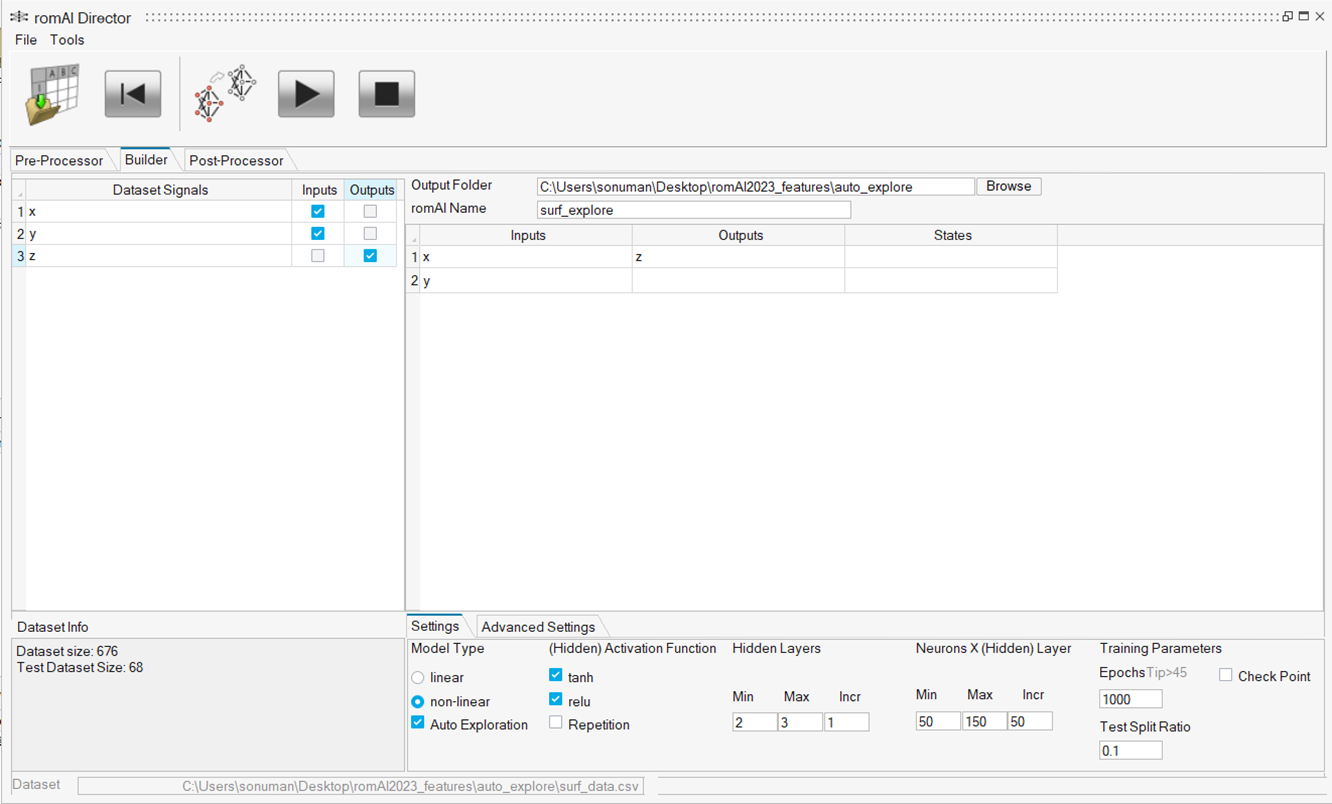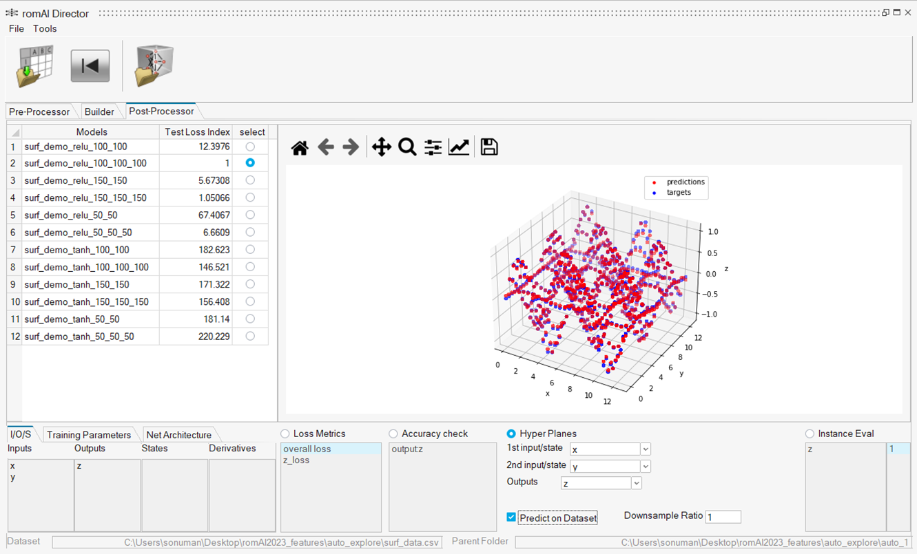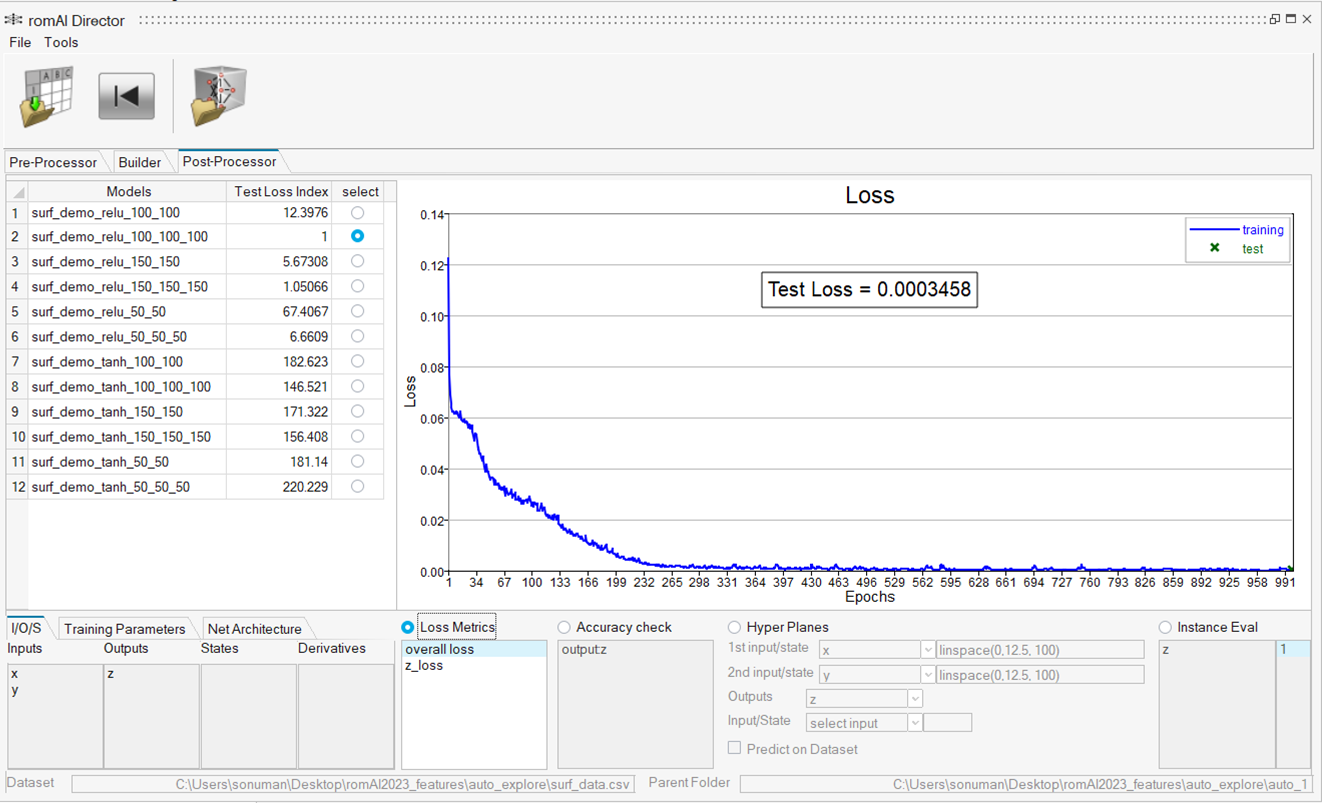 After the training is complete, the Post-Processor opens and all the models generated from the training get stored in the auto_1 folder. The best model gets automatically selected in the post-processor. The best performing model is indicated by a value of 1 in the Test Loss Index column.