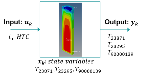 The goal is to produce a romAI model capable of predicting the temperature at three different points of the battery. Hence, the romAI model can be schematized by the following block diagram.