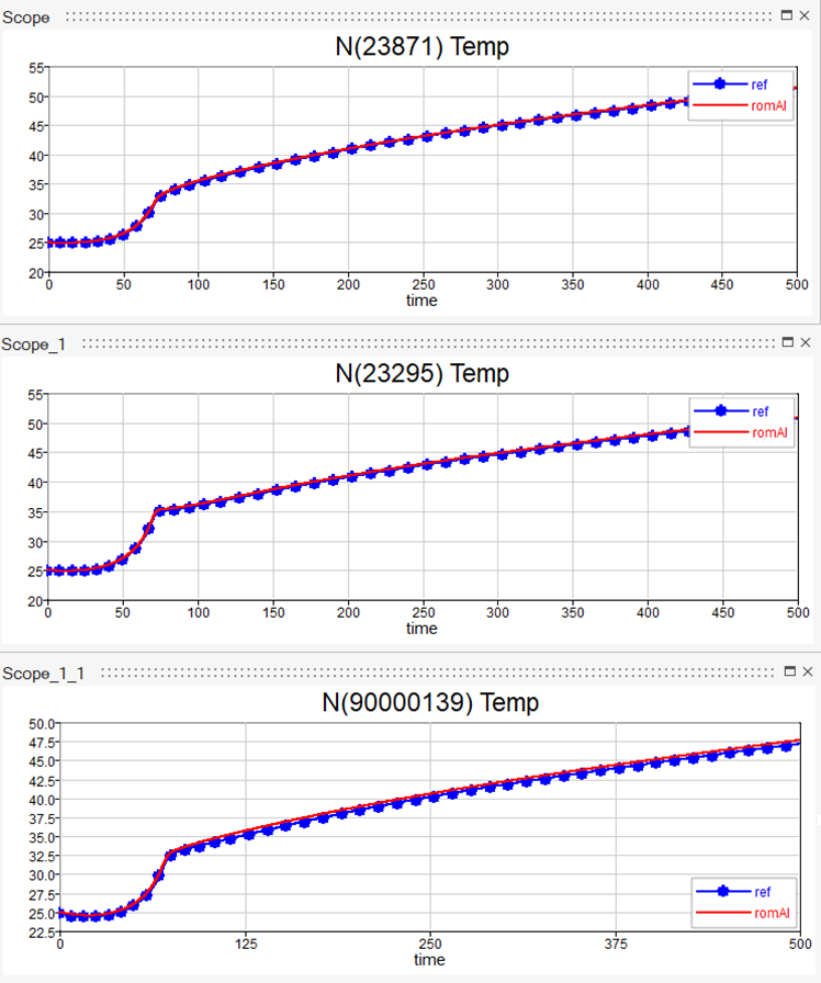 The following are the results produced by the romAI model with respect to the reference OptiStruct simulation, given the same current profile, but using a different HTC from the training dataset.
