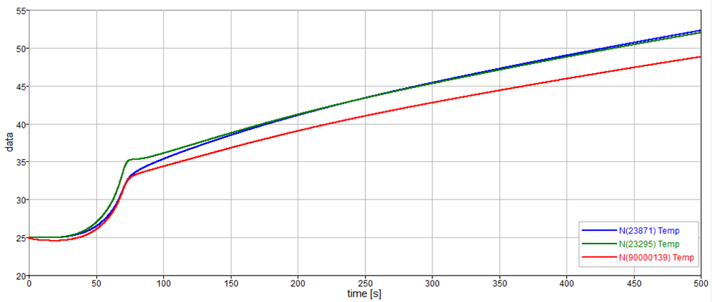 In this case, the training dataset consists of three separate time histories, which are the results of three OptiStruct thermal simulations. In the three thermal simulations, the same current profile is used, but a different HTC is deployed for each.