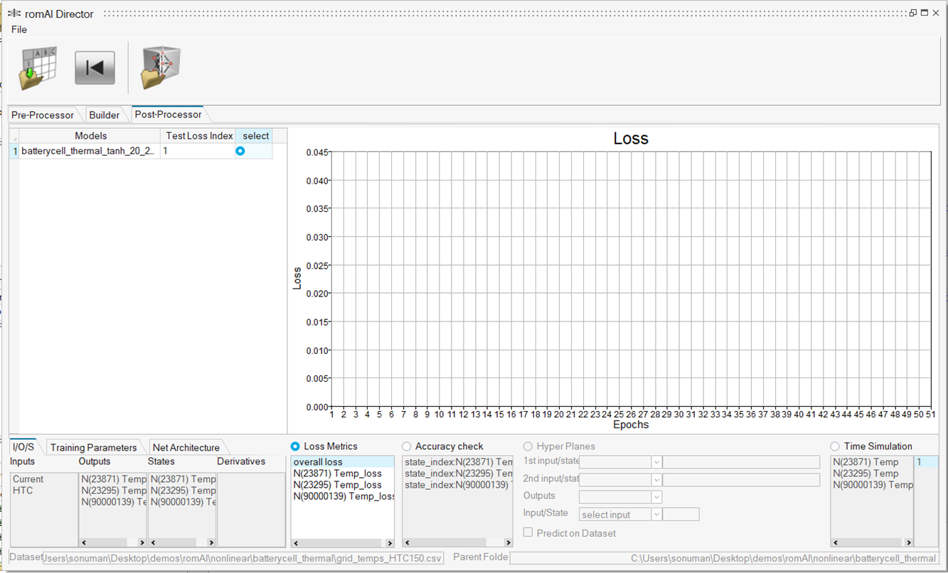 After the training has completed, the Loss vs Epochs curve is automatically displayed in the Post-Processor tab with all the other romAI model information.