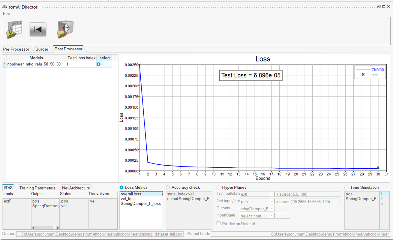 After the training has completed, the Loss vs Epochs curve is automatically displayed in the Post-Processor tab, together with all the romAI model information.