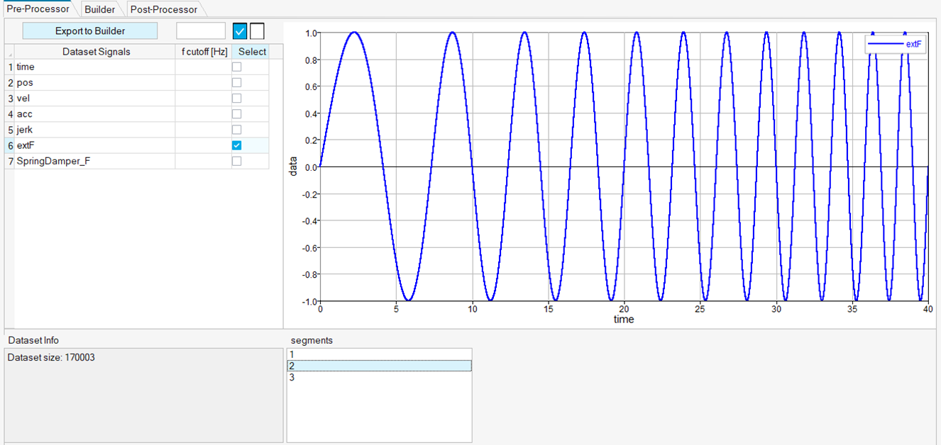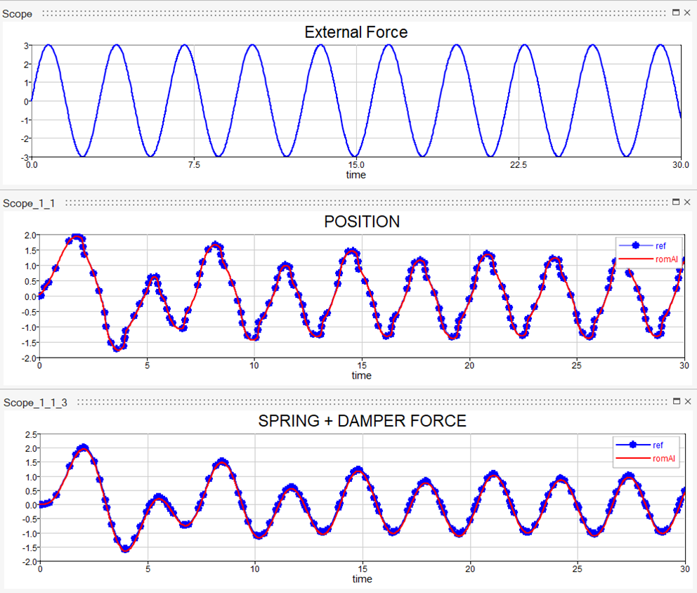 The results produced by the romAI model with respect to the reference mass-spring-damper system, given a sinewave as the external force, are shown here.