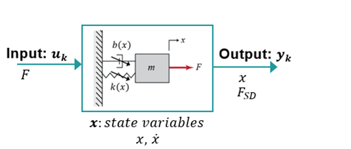 The nonlinear formulation of stiffness and damping is unknown. Nevertheless, the goal is to obtain a romAI model capable of predicting the spring-damper force and the mass position along time, given the external force and arbitrary initial conditions for the mass.