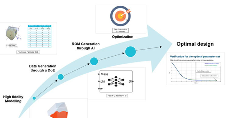 Consider the example of a bin blending process. The simulation of the full 3D model takes a day to complete. The process involves keeping the bin at a combination of angles and rotational velocities to achieve the best mixture of the components.