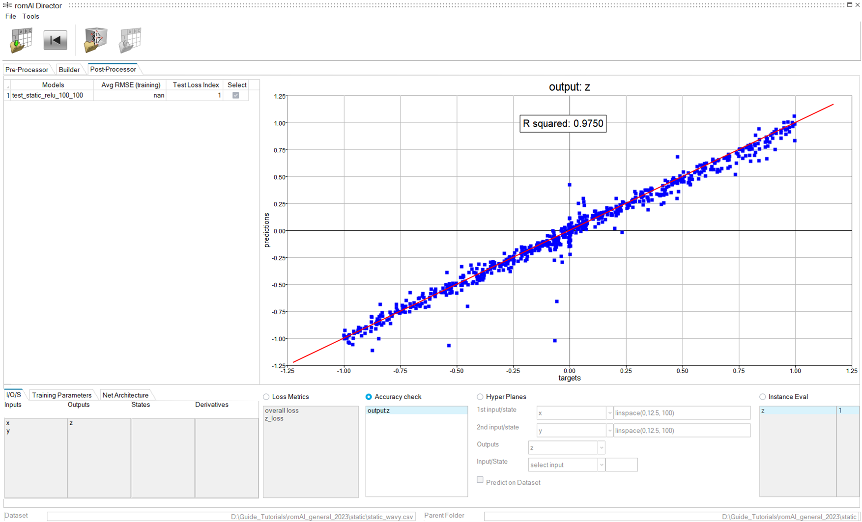 - Scatter plots of Predictions vs Targets: The application evaluates the trained romAI model into a set of points contained in a dataset file and compares the output results with the target points contained in the same dataset file through a scatter plot. Only one output at a time can be requested.