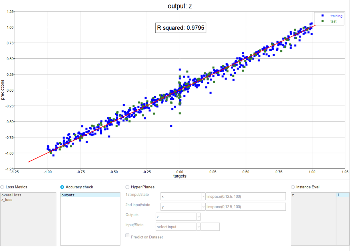 The training dataset is automatically loaded as test dataset in the post-processor just after the training. In this case, the training data points are shown with blue color and test data points are shown with green color.