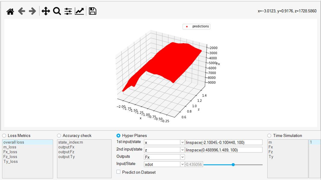 - Hyper planes: The application evaluates the trained romAI model over a range of user-defined input values and displays the output as a hyper plane. One output at a time can be displayed.