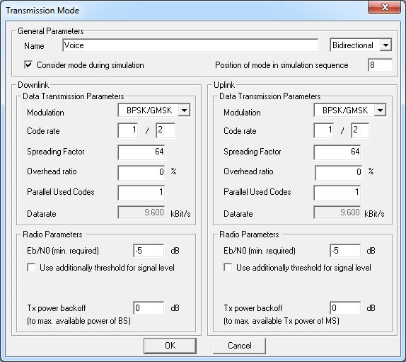 which is automatically computed in the corresponding field.Note: If multiple codes are used in parallel the own cell interference is increased in addition to the interference due to predefined cell load. Furthermore the required Tx power is increased. Accordingly there are limitations due to the defined maximum Tx power of the base station and the defined Eb/N0 target for the transmission mode. Both effects are considered in the network simulation. The computed results shown in the result tree under the defined transmission modes refer to the transmission of a single code, but the throughput results depend on the number of parallel codes (increasing the data rate which is multiplied with the number of possible streams).