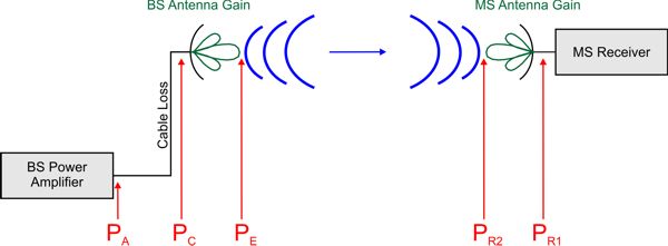 For specification of the Tx power in EIRP or ERP mode, you have to define PE (including cable loss and BS antenna gain). PR1 is the received power including the MS antenna gain.