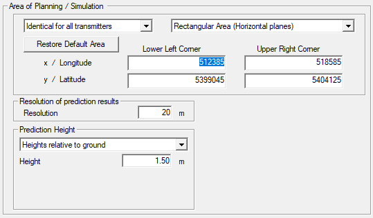 The simulation can be configured by specifying the area of planning, the resolution of prediction results, prediction height and whether additional prediction planes are defined in the database.
