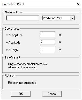 A set of prediction / receiver points can be imported from a .txt or a .csv file, and exported to a .txt file. When importing from a .csv file, a dialog will enable you to specify columns.Tip: When importing from a .csv file, you have the option to include a column with measured results. The measured results will not show up in the result tree, but a result file will be placed in the results folder. This is convenient to visualize independent results and compare them against WinProp results, for example, via menu.The prediction points can be moved by specifying a translation vector.Figure 2. The Prediction Point dialog.