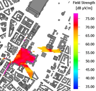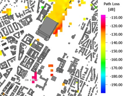 This example shows a path loss result which was masked with a clutter / morpho mask in
