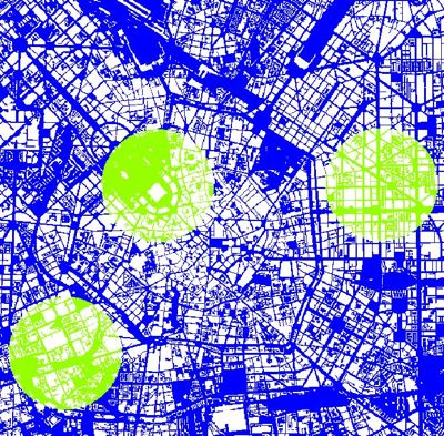 The following example shows three masks around three transmitter locations. These masks were combined to a single mask covering all three transmitter ranges.