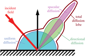 Rough surfaces and finite surfaces (thus surfaces with small dimensions regarding the wavelength) scatter the incident energy in all directions with a radiation diagram which depends on the roughness and size of the surface or volume. The dispersion of energy through scattering means a decrease of the energy reflected in the specular direction.
