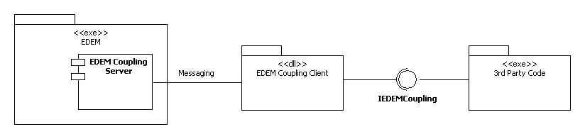 The EDEM Coupling Interface comprises client and server components. The server component resides within EDEM, and the client component is to be used by the 3rd party code to interact with EDEM. The EDEM Coupling Client Interface class provides a number of methods for setup, simulation, and data control.