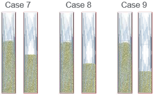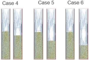 Research has shown that values of Carr Index below 15% indicate very good flow character but values above 25% indicate poor flow. Also, Hausner ratio values of around 1.00–1.25 indicate free-flowing powder, values between 1.26–1.45 indicate poor flow, and above 1.46 are related to extremely poor flow (Carr (1965), Wells (1988), Marshall (1986). The EDEM tapped density results indicate that the overall flow character of the materials is varied between excellent to fair however, the angle of repose measurements indicates that cases 4-6 have passable flow ability and cases 7-9 have very poor flow ability.
