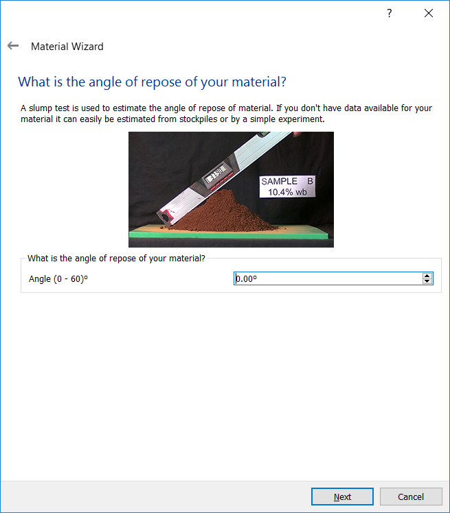 - What is the angle of repose of your material?The angle of repose is a frequently used measure of material that appears in standard test data. Even though such information is not included in current material data reports, it can still be measured in a fairly simple manner without specialized tools (for example, by monitoring the angle of a stockpile). Finally, it is a quantity that is relatively simple to estimate using engineering expertise if there is no access to any testing reports or on-site data.