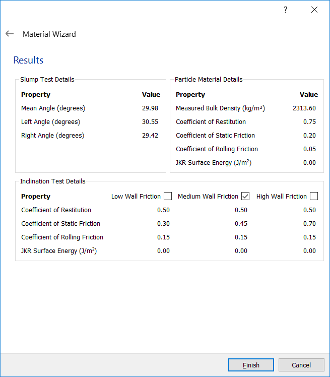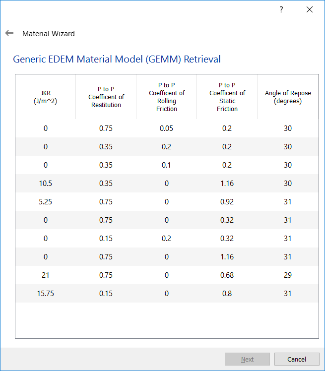 Note: You can select one of these materials.- The top material corresponds to the input angle of repose the best. You can, however, choose different materials from the list.