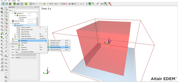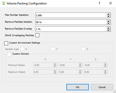 Note: The Volume Packing Configuration dialog box contains advanced settings that you can use to modify the Volume Packing behavior. The three major settings are Maximum Number of Iterations, Remove Particle Iteration and Remove Particle Overlap. A good analogy will be trying to pack flour in a jar by shaking it. A slower shaking process will pack the flour better compared to a fast and strong shake of the jar, which will often cause the flour to spill. - Click the
