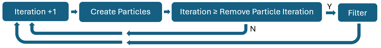 For Specify Max Number Iterations Indicates the maximum number of iterations the solver goes through to generate the particles. It affects the time required to generate the particles, and the duration of the iteration process. A large value means that a greater number of particles would be accepted and rearranged to replace the removed ones. Remove Particle Iteration Indicates a percentage of the maximum number of iterations. It sets the iteration after which the filter - which removes particles that have an overlap exceeding the value set in Remove Particle Overlap, is applied. The filter is applied gradually, removing particles with greater overlaps first, thus allowing for the remaining particles to be rearranged in the selected volume as it ramps down to the value set in Remove Particle Overlap. With a large enough number of iterations, the smaller the value, and less particles are removed from the simulation.