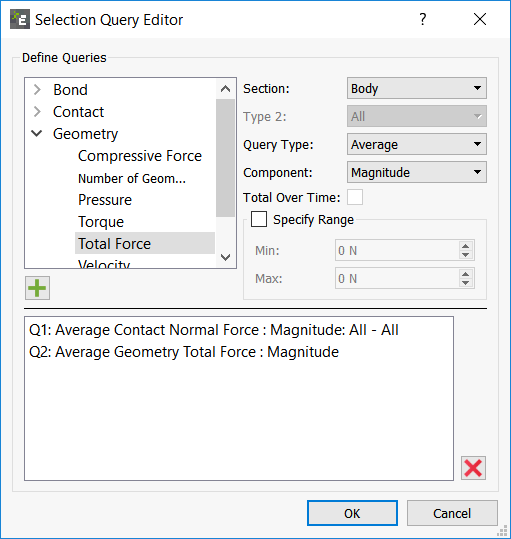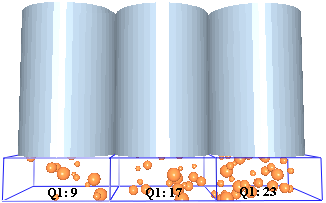 A query is used to define a single element attribute, for example, particle velocity, total force on a geometry section or number of collisions. The query information can then be displayed in the Viewer and in the Groups section in the Data Browser. Bin cells can also be colored according to the results of the query.