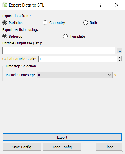 For Specify Export Data from Particles Select to export data from particles. Geometry Select to export data from Geometries. Both Select to export both Geometries and particles. Export particles using Spheres Select to export Multi-Sphere shapes. Template Select to apply an input CAD template to the particle. Particle Output file (.stl) Click to navigate to the particle output file that generates a name for the exported .stl. Global Particle Scale Select a value from the dropdown list to apply a single value scale to the spheres/templates. This will use the correct particle position but adjust the size of the particles based on the input scale. Timestep Selection Particle Timestep Select the appropriate Time Step for the particle export. - Click Export to write the .axdt file containing the load data for importing into ANSYS Workbench and the file containing the information on the particle manual selection.
