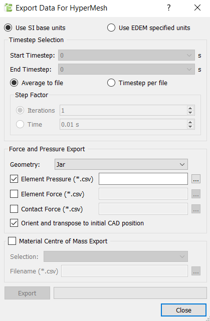 For Specify Timestep Selection Specify the Start and End Time Steps. Data can be exported for a single Time Step (where Start and End Time Steps are equal or ‘Time Step per file’ is selected) or as time-averaged values (where the Start and the End Time Steps differ and ‘Average to file’ is selected) to minimize the effects of spiking. Force and Pressure Export Geometry Select the Geometry for which data is to be exported. Element Pressure Select the checkbox and specify the element pressure to export the pressure data per Geometry mesh element. Element Force Select the checkbox and specify the element force to export the pressure data per Geometry mesh element. Contact Force Select the checkbox and specify the contact force to export the contact force data per Particle-Geometry contact point. Orient and transpose to initial CAD position Select the checkbox to allow transient analysis to be performed in HyperMesh without the Geometry moving from its initial position. For each Time Step, the force and pressure data is mapped to the initial position. Material Center of Mass Export Select the checkbox to specify a pre-defined particle (manual selection) in order to export the X, Y, and Z co-ordinates of the Center of Mass and total mass for the selection. - Click Export to write the .csv file containing the load data for importing into HyperMesh and the file containing the information about the particle manual selection.