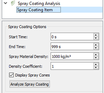 For Specify Start Time Indicates the start time at which spray coating should be applied End Time Indicates the end time at which spray coating should be applied Spray Material Density Indicates the density of the coating substance, which will only be used to calculate the coating volume and thickness Density Coefficient Indicates a dimensionless number that controls the number of ray-tracing rays. In general, higher numbers mean a slower but more detailed analysis. A density coefficient of 1.0 is roughly equivalent to one ray per particle face for a particle at the furthest distance from the spray. Display Spray Cones Select the check box to display the direction and position of the spray cones. For more information about how Spray paths are uniformly distributed in a cone formation, see How it works. Analyze Spray Coating Click to start the spray coating analysis. A console displays the progress of the calculation. If you click Cancel to end the analysis earlier, partial results will still be saved.