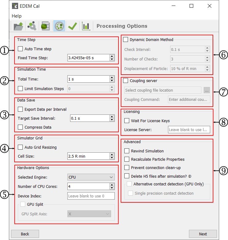 | Advanced | You can select additional parameters using these checkboxes. For more information on the parameters, see EDEM Simulator Settings. |