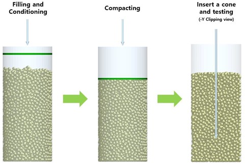 The Cone Penetrometer test measures the resistance to a cone that is penetrating a cylindrical bed of consolidated granular material at a constant rate. The measurement is used to characterize the strength of the soil ASAE S313.3.. The Geometry of the cone in the model conforms to ASAE S313.3.