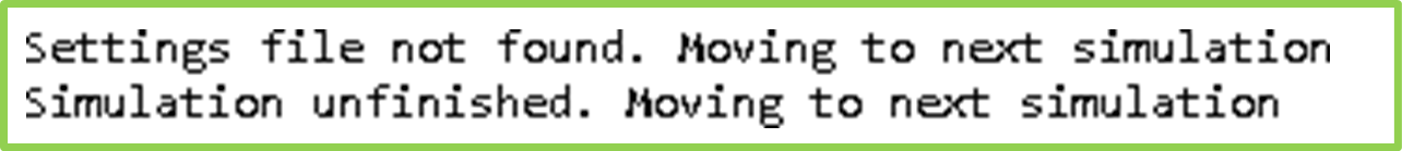 Only complete simulations with corresponding settings files will be post-processed. Otherwise the script will produce error messages as shown in Figure 5 and move to the next simulation in the folder tree.Note: All simulation files must have unique folder names and simulation names. If the simulation names are identical, the results report will be overwritten.Figure 5. Possible error messages