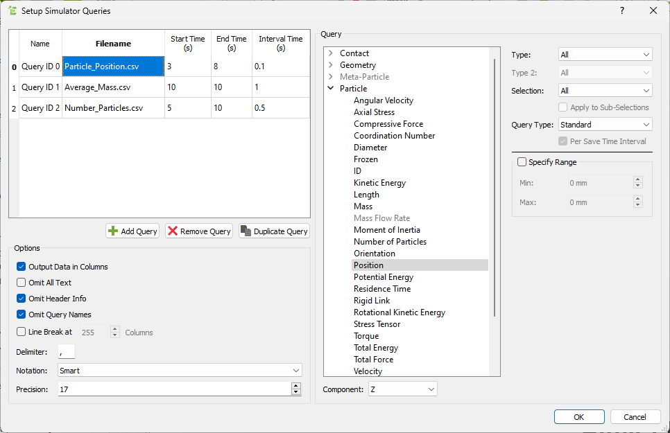 csvfiles will be copied to the folder which contains the.demfile associated with the simulation.Note: For more information about the data types which can be exported using Queries, see Results Data.