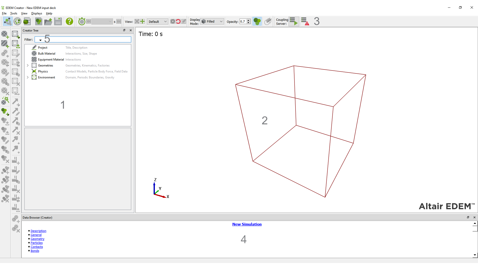 The Tree is displayed on the left side of the EDEM window and allows you to input Bulk Material, Equipment Material, and define the simulation environment. The tree comprises icons and a right-click menu system. EDEM Creator and Analyst use a similar tree system.